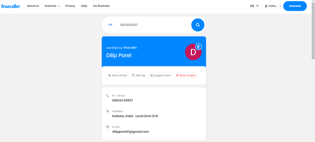 步骤2)Truecaller随后提供该人的信息。它会显示个人的图片、姓名、电子邮件、手机号码以及他们居住的城市。