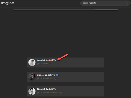 Imginn 是最快的第三方网站之一,可轻松搜索且无需注册。我特别推荐它给正在寻找免费工具的用户和不太懂技术的人。它几乎不需要您做任何事情——**只需输入姓名并点击搜索**。我所有的搜索都成功了,但此工具无法找到在 IG 上没有在名称部分或用户名中添加真实姓名的人。在这种情况下,您必须求助于反向名称查找网站。有时,您可能会获得压倒性的结果。当发生这种情况时,请单独访问用户名链接以找出是否是正确的人。