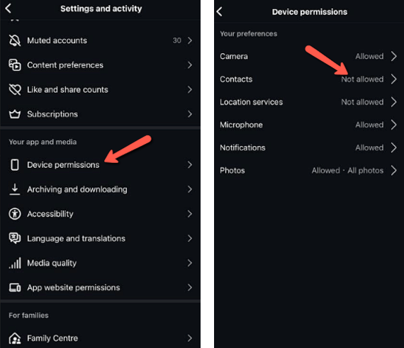 您还可以使用它来查找您认为可能已停用旧个人资料的人的新帐户。但是,即使同步后,有时 IG 也会显示“无可用建议”。在这种情况下,您可以使用“关注联系人”选项。也可能存在说“请求被拒绝”的同步问题,这可能是由于应用权限和手机型号所致。在这种情况下,请转到设备的原生“设置”应用程序,为 Instagram 提供联系人访问权限。