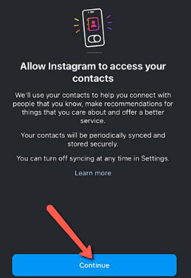 步骤 3)最后,点击“继续”并完成同步。您可以随时关闭它。现在,重新启动 Instagram 应用程序并进行检查。稍后,您可能会通过“您可能认识的人”收到建议,或者点击您个人资料上的“显示人物”选项,即带有加号的肖像剪影。