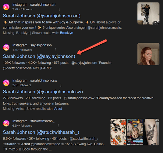我建议使用昵称、更改拼写、添加出生日期、特殊字符、表情符号等。在 Instagram 上,您现在会发现姓名可以与附加关键词匹配,这可以成为定位某人的一个好开端。 - 想想他们可能属于的机构、组织和社区——
