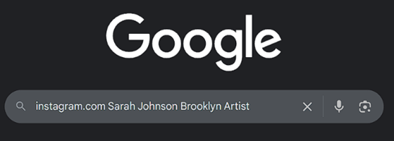 步骤 1)访问 https://www.google.com/ 并输入:site:instagram.com “全名”和“地点”或“爱好/兴趣”,然后按 Enter。