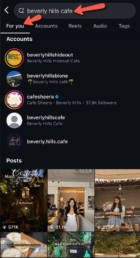 如果第一次尝试不起作用,请尝试“为你推荐”部分,看看他们是否发布了任何内容。在此选项卡中,我主要找到了咖啡馆自己上传的 Reels 和视频。另一方面,您可以浏览这些搜索结果中的地点个人资料进行更深入的挖掘。