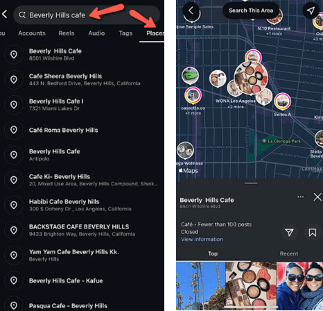 我从亲戚那里听说我失散多年的大学朋友现在住在贝弗利山庄。这让我尝试在 IG 上查找她,但没有帮助。这时我才想起她喜欢咖啡馆。因此,我尝试了位置标签技巧。要使用此方法,请在点击“搜索”后,点击“地点”选项。这将引导您在地图上找到多个帖子和带位置标签的内容。