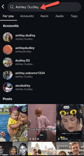 我尝试使用朋友 Ashley Dudley 的全名进行搜索,在查看了大约 5 个个人资料后找到了她。