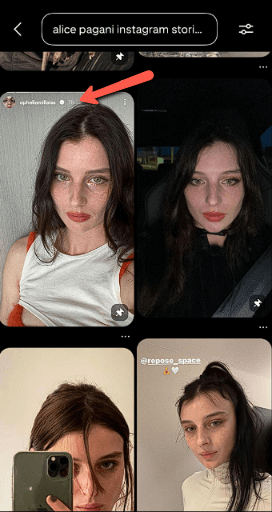 至于 Pinterest,您可能需要做一些更深入的挖掘,因为在此应用中没有直接查找某人 Insta 帐户的方法。因此,您必须键入类似“全名+Instagram Story”、“全名+Instagram Post”、“全名+Instagram Reel”等的关键字。我最喜欢故事技巧,因为它通常包含他们的用户名,这可能会出现在截图上。例如:Alice Pagani Instagram Story。