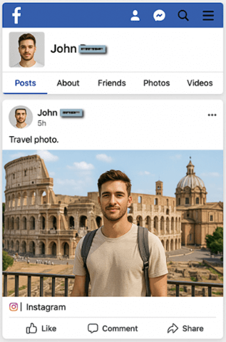 Facebook、Twitter、Pinterest 和 Threads 等社交媒体是在 Insta 搜索失败时开始查找的好地方。有一次,我想找到一个我在公共活动中遇到的人,但我太害羞了,不敢问他们的 Instagram。因此,当我找到他们的 Facebook 时,我查看了他们的图片,看看是否有通过 Instagram 分享的内容,因为有一个“交叉发布”选项。这引导我找到了他们的 Instagram 帐户,但是,有时您甚至可以在他们的“基本信息”部分找到链接。