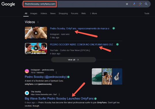 在Google上搜索社交媒体用户名或仅一个名称,并附加OnlyFans,也可能会找到该个人的OF帐户。这是一个简单的技巧,可能有效,也可能无效。我可以通过此方法找到一些个人资料。例如,我搜索了“PerdroScooby: OnlyFans.com”。您可能无法获得直接的个人资料链接,但Google肯定会带来相关内容,让您大致了解他们的帐户。
