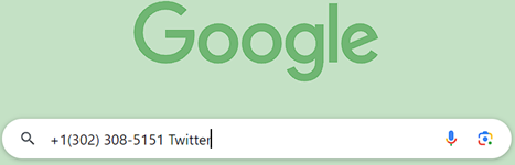 第1步)转到常规的Google搜索引擎页面。在搜索栏中输入电话号码,然后输入“Twitter”,例如“+1(302) 308-5151 Twitter”。