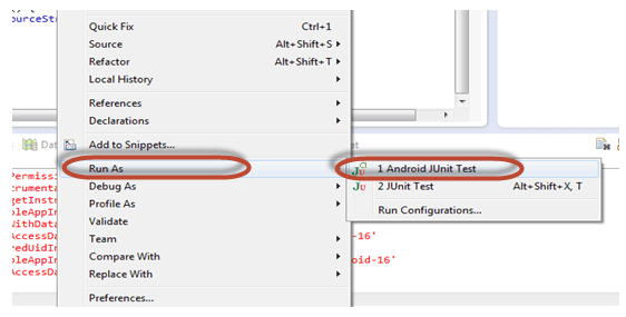 - 在您的 IDE 中,右键单击 -> 运行方式 -> 安卓单元测试