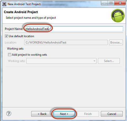 输入您的测试项目名称。按照命名约定,您的测试项目应命名为“HelloAndroidTest”