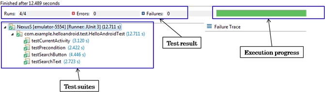 除了在 IDE 上运行测试,您还可以在命令行上运行测试。在这个测试程序中,测试包是 com.example.helloandroid.test。在 Linux 终端中,您可以使用以下命令运行此包中的所有测试