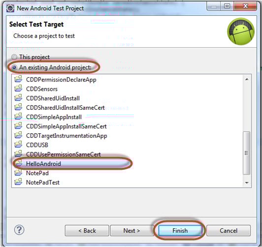 选择要测试的目标应用程序。在这种情况下,这是 HelloAndroid,点击完成