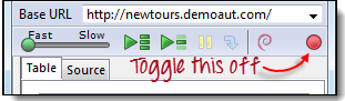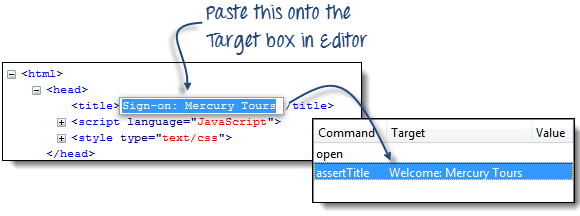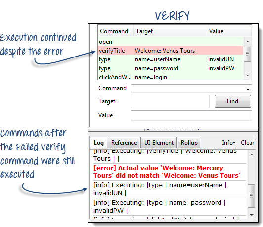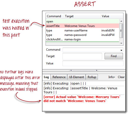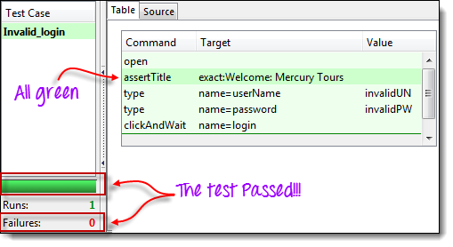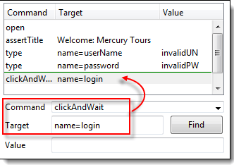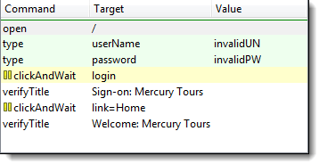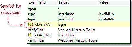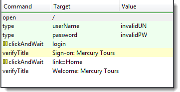 “clickAndWait | login”行运行并暂停到下一个命令(verifyTitle | Sign-on: Mercury Tours)。 请注意,即使没有断点,下一行也会暂停。这是“步进”功能的主要目的——它逐个执行后续命令,以便您有更多时间检查每个步骤之后的结果。 |
