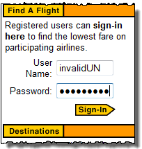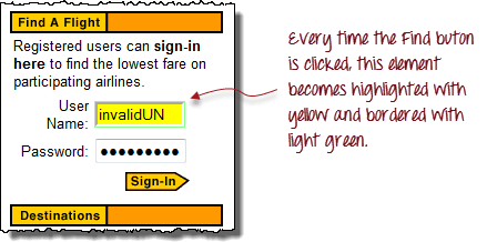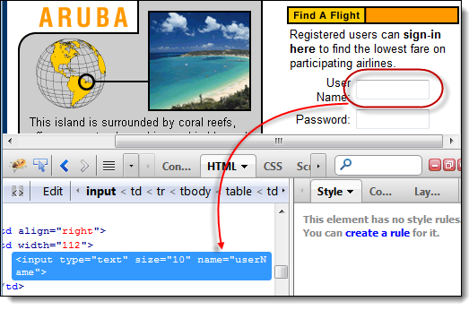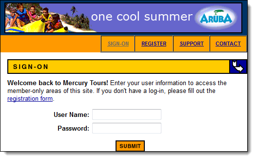 点击“查找”按钮。注意,Mercury Tours 页面中的“用户名”文本框会突出显示一秒钟。