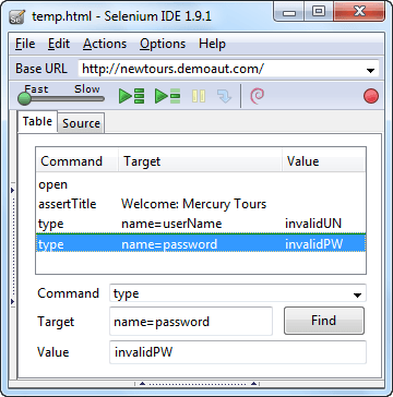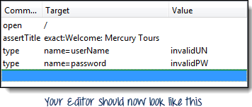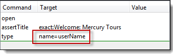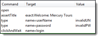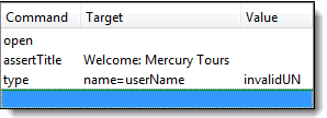 仍在“目标”文本框中,在“userName”前添加“name=”,表示 Selenium IDE 应将目标设置为 NAME 属性为“userName”的元素。 在 Selenium IDE 的“值”文本框中输入“invalidUN”。您的测试脚本现在应该如下图所示。我们已经完成了第三个命令。注意:您可以使用任何其他文本字符串代替 invalidUN。但是 Selenium IDE 区分大小写,您需要完全按照应用程序中的值/属性进行输入。 |