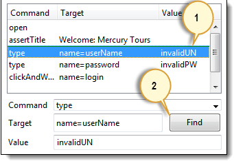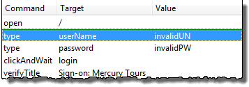 步骤 1) 确保您的浏览器位于 Mercury Tours 主页上。点击您希望执行的命令。在此示例中,点击“type | userName | invalidUN”行。