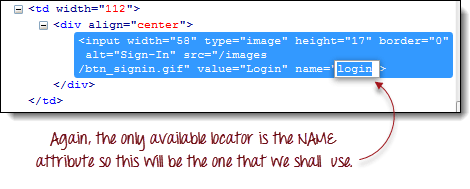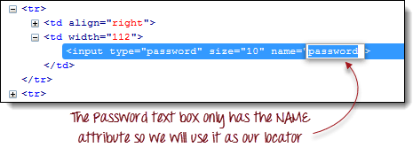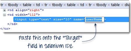 | 步骤 6 注意,“用户名”文本框没有 ID,但它有一个 NAME 属性。因此,我们将使用其 NAME 作为定位器。复制 NAME 值并将其粘贴到 Selenium IDE 的“目标”字段中。