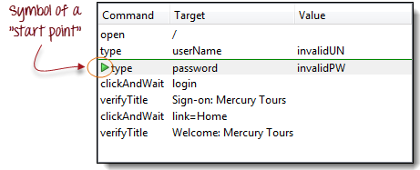 在上面的例子中,回放将从第三行(type | password | invalidPW)开始。一个测试脚本中只能有一个起点。