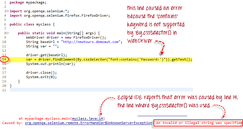 在上面的 Selenium IDE 中,整个测试都通过了。然而,在下面的 Selenium WebDriver 脚本中,相同的测试产生了错误,因为 WebDriver 在 By.cssSelector() 方法中不支持“contains”关键字。
