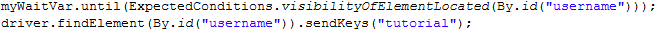 在需要显式等待发生的部分,将 myWaitVar 与 ExpectedConditions 一起使用。在这种情况下,我们将在“username”(Mercury Tours 主页)输入上使用显式等待,然后才在其中键入文本“tutorial”。