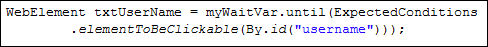 - elementToBeClickable() – 等待直到元素可见并同时启用。下面的 Selenium 示例代码将等待直到 id=”username”的元素可见并启用,然后才将该元素分配为名为“txtUserName”的 WebElement 变量。
