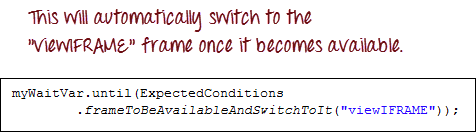 - frameToBeAvailableAndSwitchToIt() – 等待直到给定框架可用,然后自动切换到它。