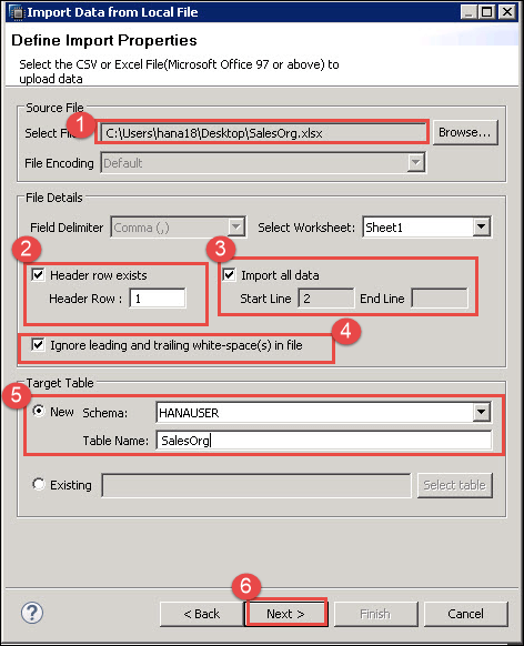 - 目标表 – 在此部分有两个选项 –新建 – 如果表不存在于 SAP HANA 中,则选择此选项,并提供现有模式名称和要创建的表名称。