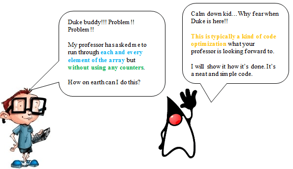您可以看到计数器的使用,然后将其用作数组的索引。Java 提供了一种使用“for”循环的方法,该循环将遍历数组中的每个元素。