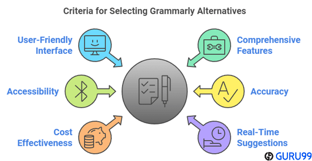选择 **最佳免费 Grammarly 替代品** 需要对不同方面进行全面评估。在 **Guru99**,我们对可信度的承诺坚定不移,专注于获取准确、相关和客观的信息。我们研究了 25 多个替代品,投入了 70 多个小时,为您带来一系列提供卓越功能的免费和付费工具。严格的内容创建和审查确保了可靠的推荐。请参阅以下帮助我们创建此综合指南的重要因素。