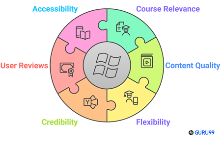 在 Guru99,我们致力于提供准确、相关和客观的信息,以确保值得信赖且信息丰富的内容。严格的内容创建和审查流程有助于有效回答您的问题。在分析了 40 多个在线最好的免费 Microsoft 课程后,我们确定了提供认证的有价值的选项。这些课程包括详细的功能、优缺点和定价见解。选择正确的课程可能很具挑战性,因此考虑质量和相关性很重要。请查看以下重要的选择因素。