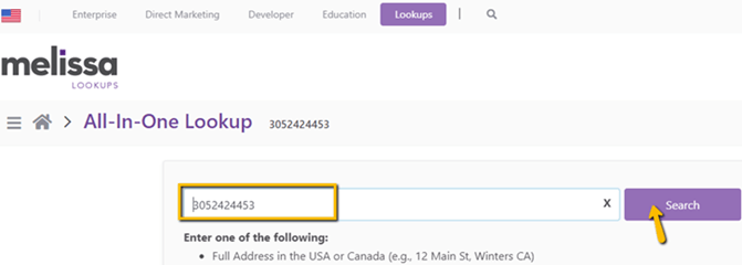步骤 1) 首先,访问 https://lookups.melissa.com/home/,在搜索栏中输入号码,然后点击 **搜索**。