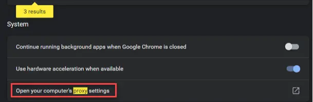 步骤 1)首先,您需要找到连接设置菜单。转到您的浏览器设置并搜索“代理设置”。