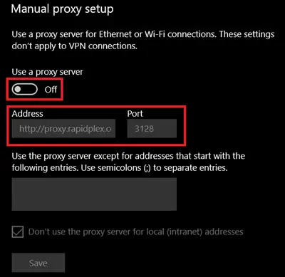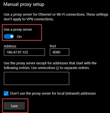 步骤 3)之后,打开代理并填写地址和端口。请注意,如果代理列表网站给您一个数字,例如 186.47.97.122:8080,作为示例。您应该将地址填入 186.47.97.122,并将端口填入 8080。不要忘记按保存按钮。