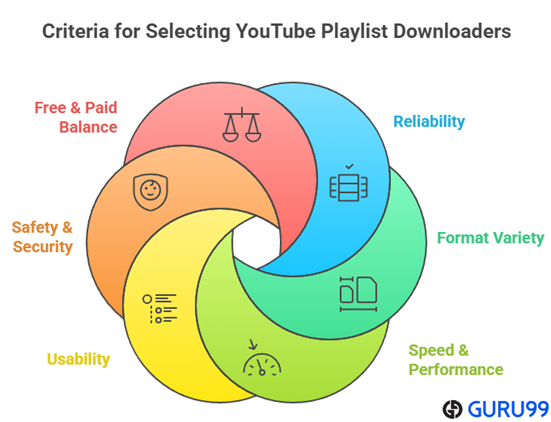 在Guru99,我们致力于通过为每位读者提供准确、客观和相关的信息来保持信誉。在测试了 90 多个小时和超过 20 个工具后,我们的团队编制了这份最佳 YouTube 播放列表下载器列表——平衡了免费和付费选项以确保多功能性。我们的专家见解强调了误导性功能如何扰乱工作流程,使可信的评论变得至关重要。本指南提供了基于真实用户需求的最新、高质量的推荐,重点关注可用性、安全性、速度和格式灵活性。它旨在帮助用户做出明智、安全的选择。我们在审查工具时,根据以下因素进行评估: