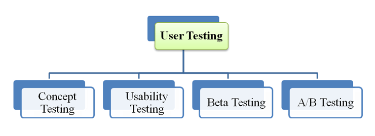 用户测试是 iOS 上的一种手动测试。此测试的目的是创建更好的应用程序,而不仅仅是无缺陷的应用程序。下图显示了四种类型的用户测试。