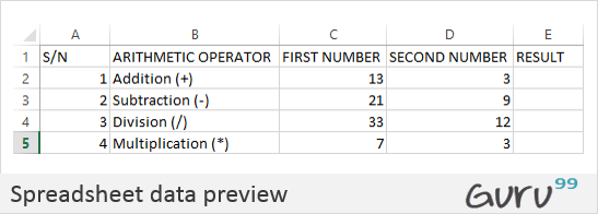 在本教程中,我们将执行基本的算术运算,即加法、减法、除法和乘法。下表显示了我们将使用的数据以及我们应该期望的结果。