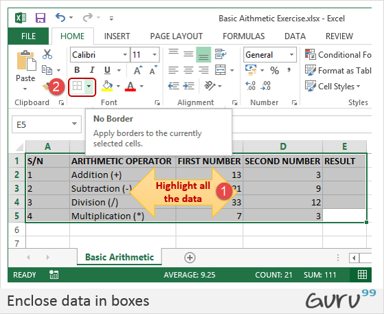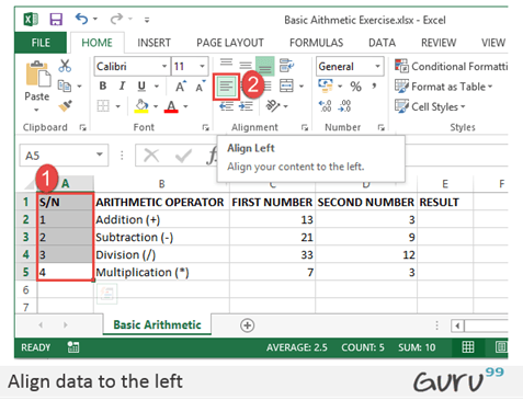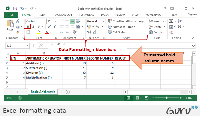 我们都喜欢美好的事物,不是吗?Excel 中的格式化可以帮助我们做到这一点。我们可以使我们的电子表格更具吸引力。我们将使用算术运算表中的数据。我们将把列名设为: