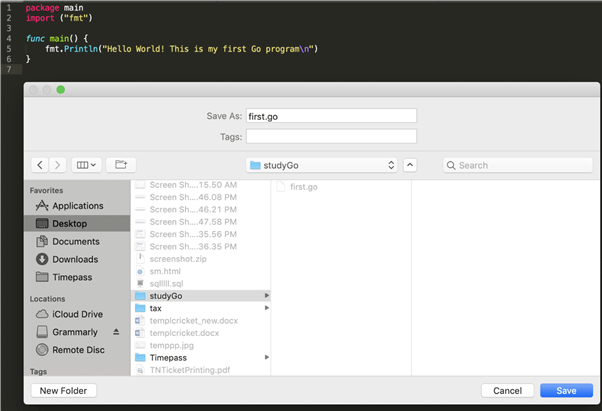 创建一个名为 first.go 的文件,并将以下代码添加到其中并保存
