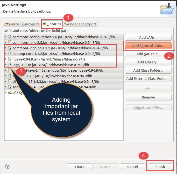 在此步骤中,我们将把相关的 HBase jars 添加到 Java 项目中,如下图所示。