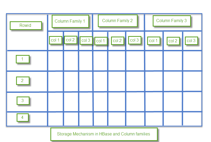 HBase 是一个面向列的数据库,数据存储在表中。表按 RowId 排序。如下所示,HBase 具有 RowId,它是表中存在的多个列族的集合。