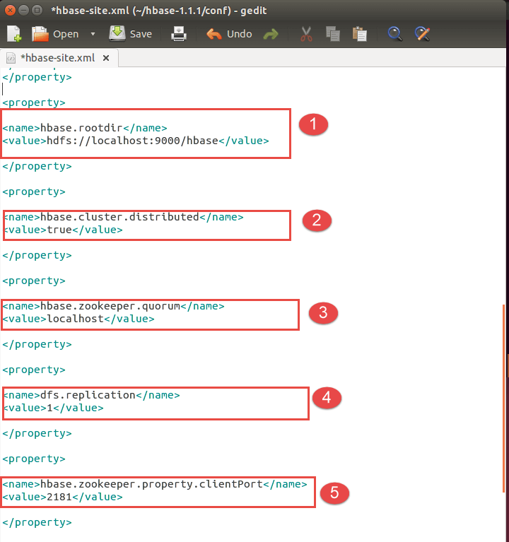 <property> <name>hbase.rootdir</name> <value>hdfs://:9000/hbase</value> </property> <property> <name>hbase.cluster.distributed</name> <value>true</value> </property> <property> <name>hbase.zookeeper.quorum</name> <value>localhost</value> </property> <property> <name>dfs.replication</name> <value>1</value> </property> <property> <name>hbase.zookeeper.property.clientPort</name> <value>2181</value> </property> <property> <name>hbase.zookeeper.property.dataDir</name> <value>/home/hduser/hbase/zookeeper</value> </property>