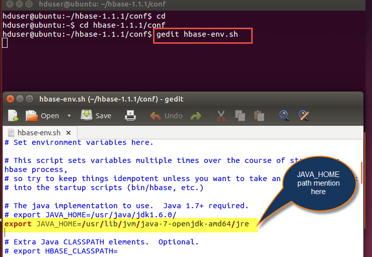 | export HBASE_HOME=/home/hduser/hbase-1.1.1 export PATH= $PATH:$HBASE_HOME/bin |