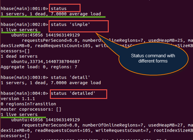 hbase(main):001:0>status hbase(main):002:0>status 'simple' hbase(main):003:0>status 'summary' hbase(main):004:0> status 'detailed'