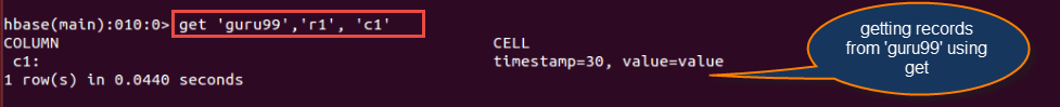 hbase> get 'guru99', 'r1', {TIMERANGE => [ts1, ts2]}