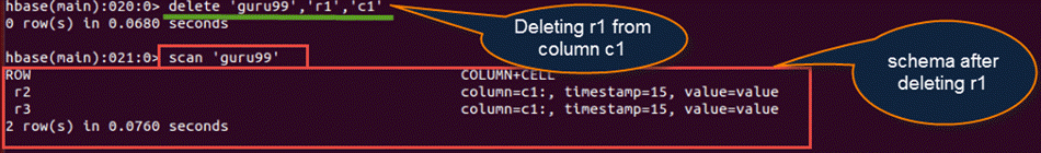 hbase(main):)020:0> delete 'guru99', 'r1', 'c1''.