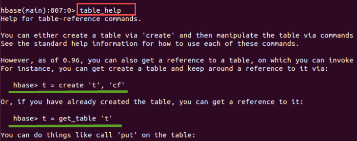 - 上面的屏幕截图显示了“create”和“get_table”命令的语法及其用法。一旦在HBase中创建了表,我们就可以通过这些命令来操作它。