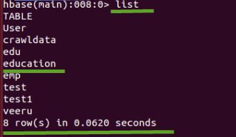 为了检查“education”表是否已创建,我们需要使用下面提到的“list”命令。