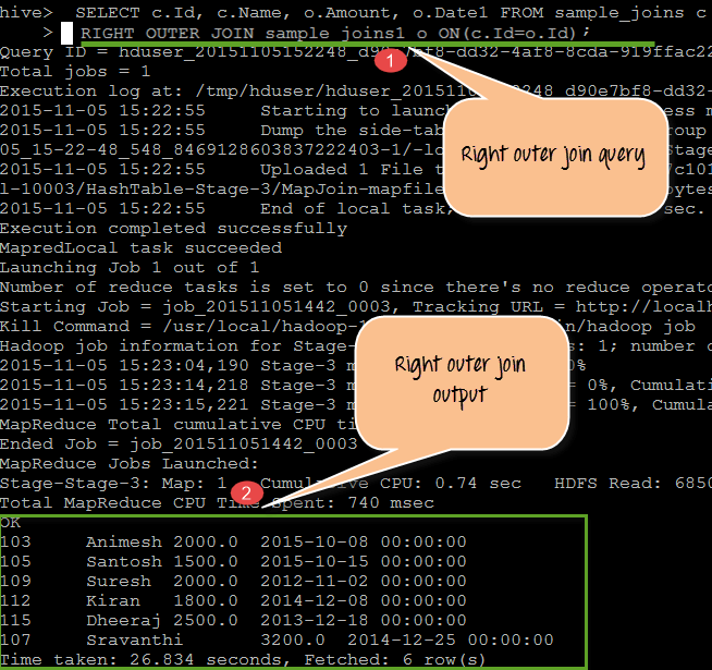 SELECT c.Id, c.Name, o.Amount, o.Date1 FROM sample_joins c RIGHT OUTER JOIN sample_joins1 o ON(c.Id=o.Id)