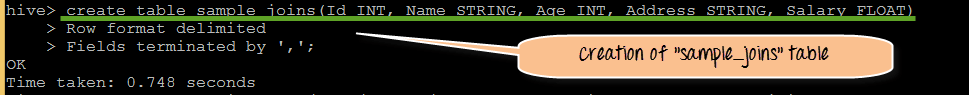 步骤 1) 创建表“sample_joins”,其列名为 ID、Name、Age、address 和 salary。